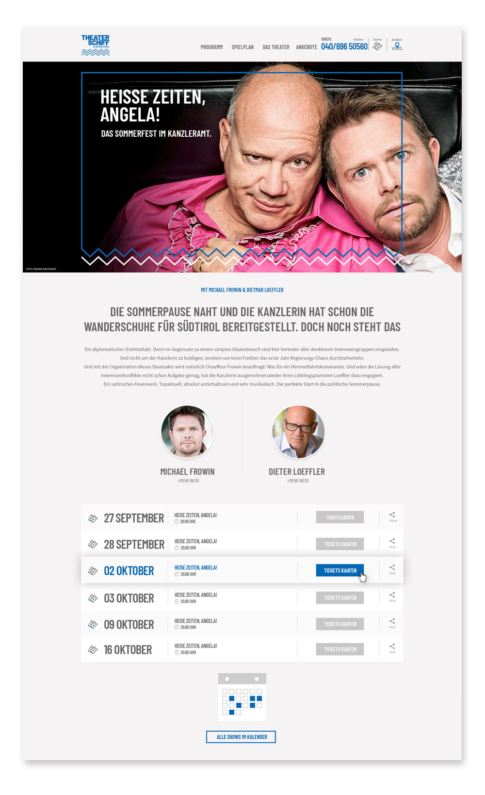 Als wir das neue Erscheinungsbild bereit für den Stapellauf war, hatten wir das Rüstzeug für einen kompletten Relaunch der sehr wichtigen Website. Dem primären Nutzerbedürfnis folgend stellten wir Informationen zum Programm und zum Ticketkauf in den Fokus. Eine übersichtliche Programmansicht mit Filteroptionen sowie ein visuell aufgebauter Spielplan erleichtert den Seitenbesuchern den Informationszugang. Ein eigens für diesen Zweck entwickeltes, redaktionelles Backend ermöglicht den Theatermachern derweil die komfortable und schnelle Pflege der Spielinhalte und Schauspielerinfos.